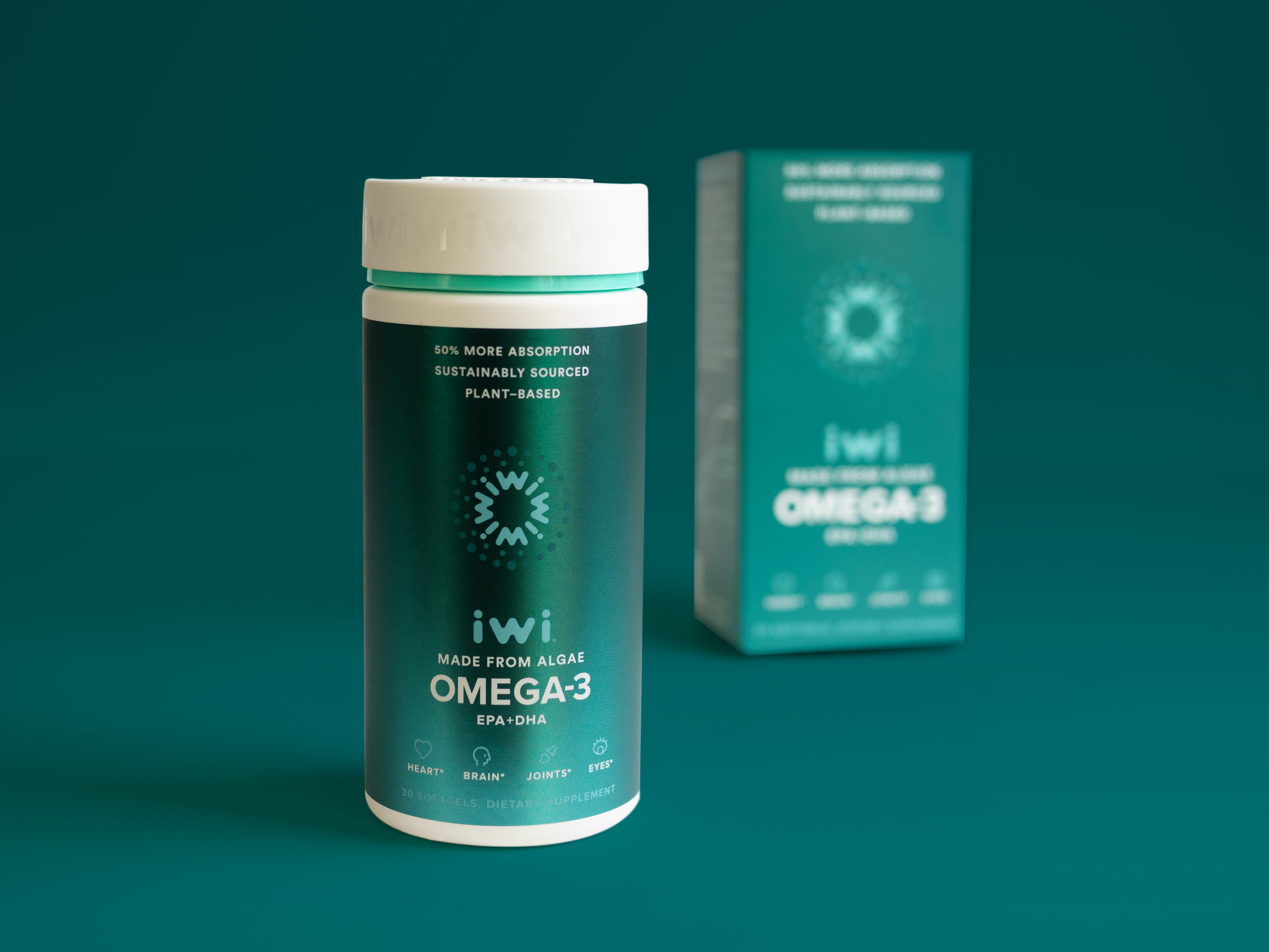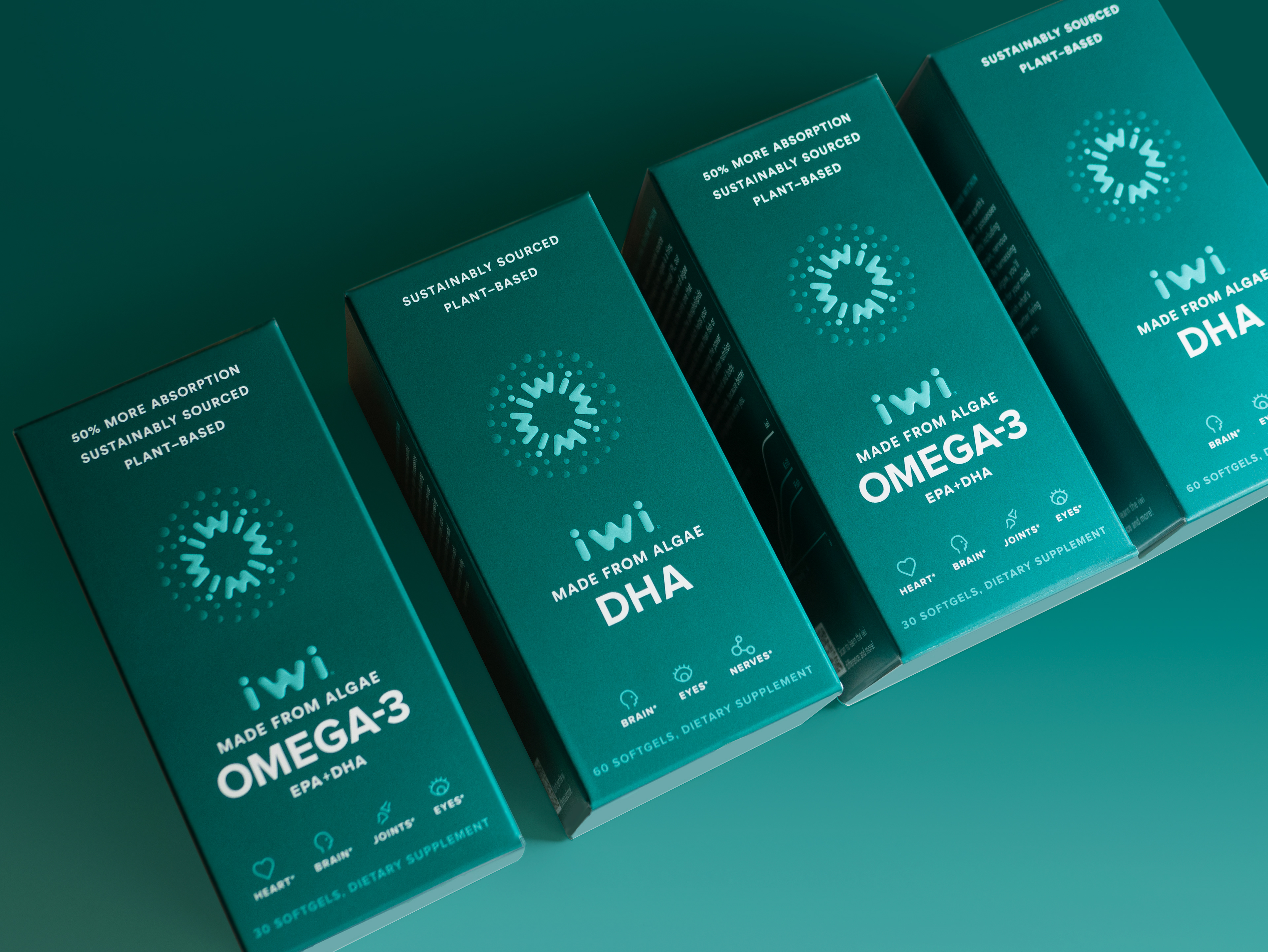 iwi (pronounced EE-wee) is sustainable nutrition made from algae. As Earth’s original superfood, algae is naturally nutrient-rich. It gives us clean protein and and omega-3s that our bodies absorb more easily than traditional forms of omega-3s, like fish or krill oil. The iwi identity celebrates the beauty in their science. The look and feel is dominated by a deep green gradient—a strong, distinct hue that comes from the color of their patented algae. All together, iwi's new brand is an elegant translation of their purpose: Together we create sustainable food solutions for everyone on our planet.